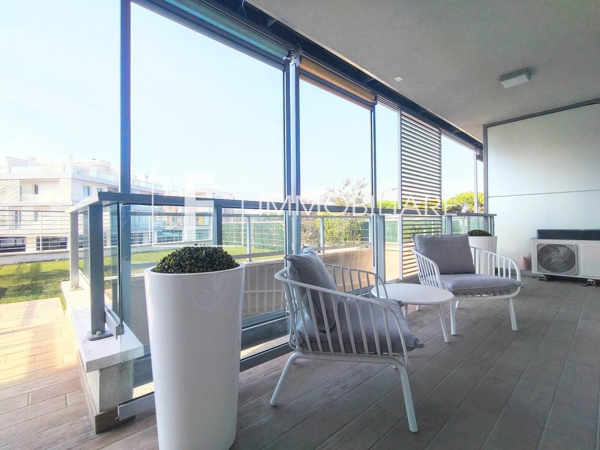 L’unità in proposta si trova al piano primo, è servita da ascensore e dispone di un ampio salone di ben 29 mq, ben illuminato grazie alle ampie vetrate scorrevole che accompagnano l’ospite sulla splendida terrazza esterna di circa 20 mq. Dal soggiorno si accede direttamente ad un esclusivo lastrico solare di circa 50 mq ad uso privato.