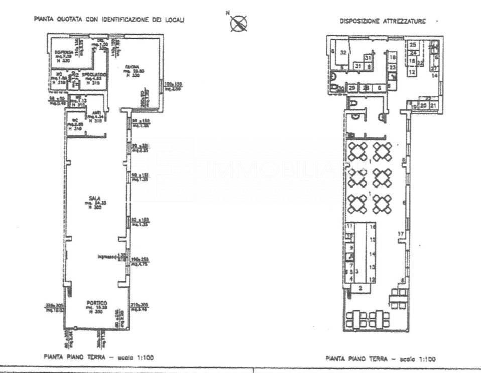 Area Tecnica: Un disimpegno, posto dietro il bancone, conduce ai servizi igienici per i clienti e alla cucina professionale, attrezzata con piastre, fuochi, forni, zona lavaggio e impiattamento.