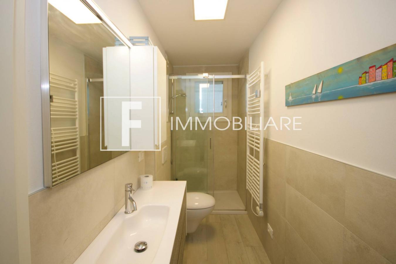 Infine i due bagni, entrambi finestrati e dall'arredo moderno, completi di sanitari sospesi, scaldasalviette, mobile lavandino di design e box doccia in cristallo. La lavatrice è invece collocata in un piccolo ripostiglio a scomparsa.