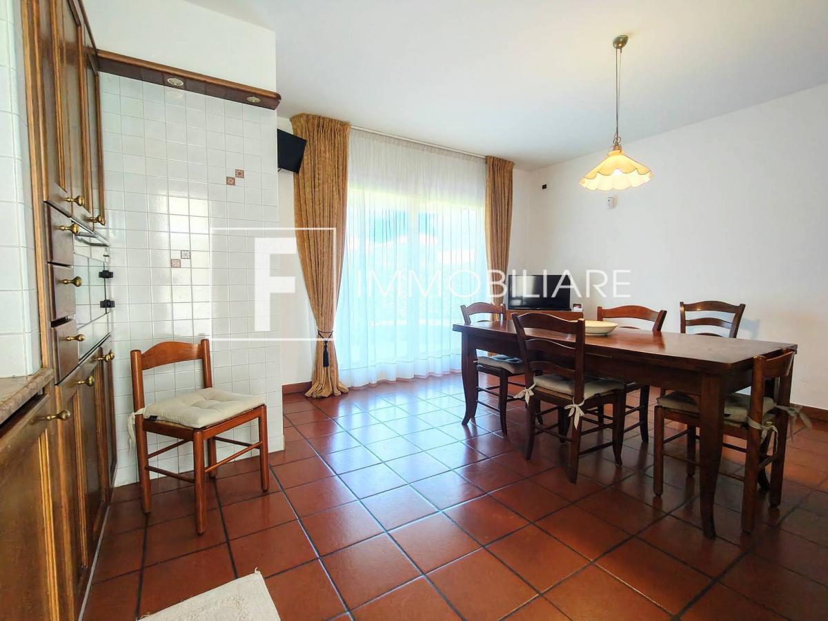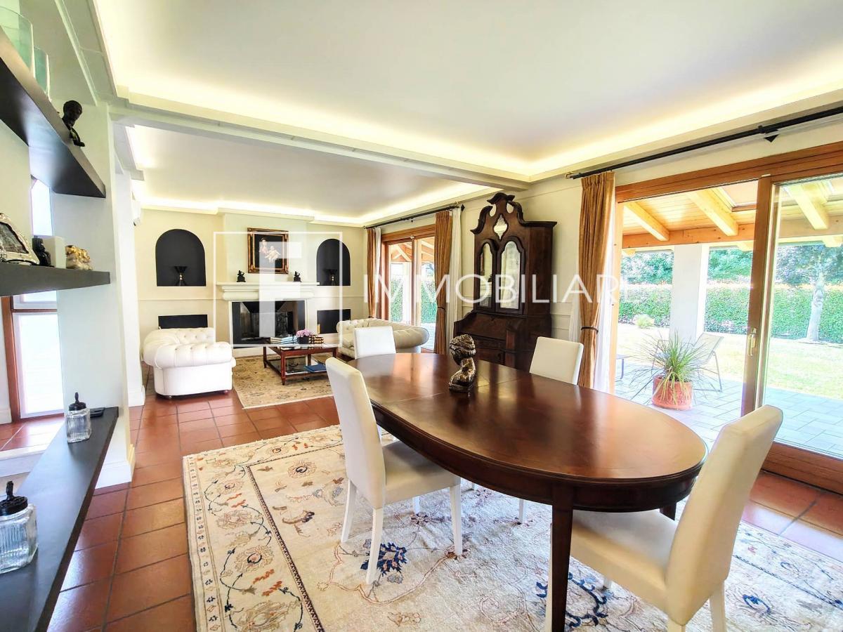 D’all’ingresso si accede alla zona living open space dotata di caminetto e tavolo da pranzo che colpisce per la piacevole illuminazione naturale proveniente dalla grande parete finestrata che affaccia sul giardino, dalla quale si può godere di un’ampia pompeiana coperta e abitabile per pranzare o cenare all’aperto.